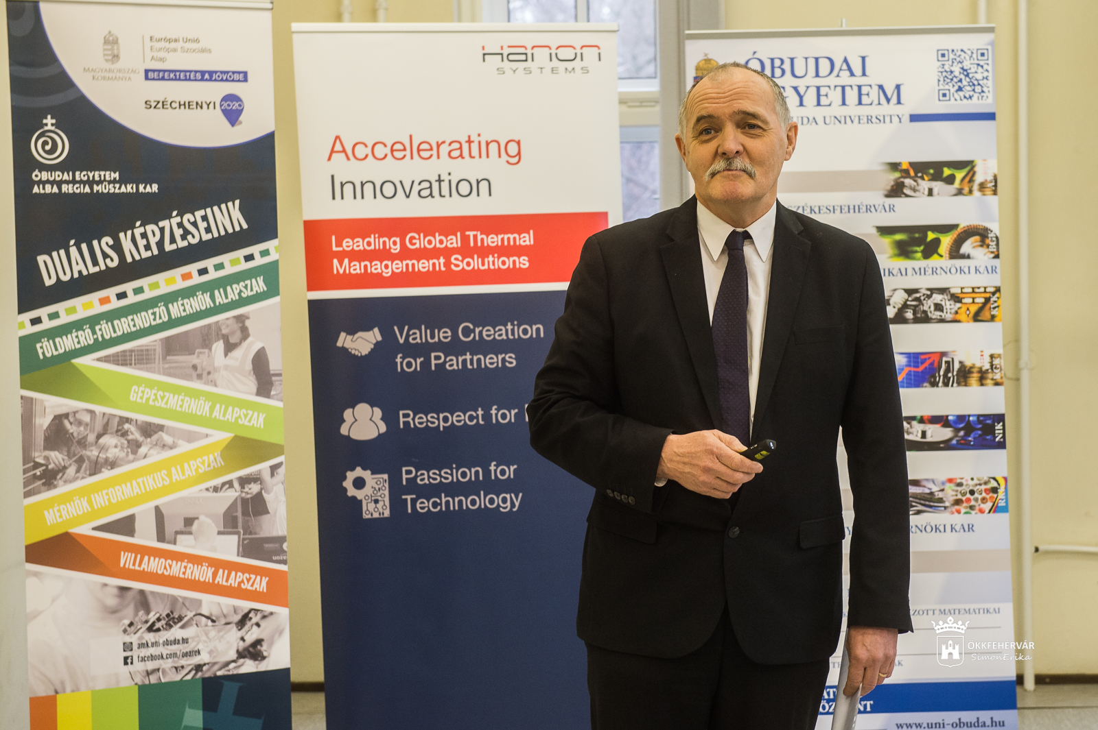 Karikó Zsolt a Hanon Systems Hungary ügyvezető igazgatója 25 éve diplomázott a Budapesti Műszaki Egyetemen, ahol akkoriban két ipari robot programozásával sikeres diplomamunkát készített. Beszélt arról, hogy úgy kerülnek ki végzett mérnökök a felsőoktatásból, hogy a vállalatnak kell megtanítania robotprogramozásra és sok új technológiára. A fehérvári ipar szerencsére nagyon erős és ez azt is jelenti, hogy nagyon kicsi a munkanélküliség, ami a növekedés gátja is lehet egyben. Erre a kihívásra is válasz a robottechnológia, így 2-3 éven belül a Hanon is nagy beruházást tervez megvalósítani, aminek egy része közel 250 ipari robot munkába állítása is, amihez szakemberek is szükségesek. Szeretnénk az egyetemmel oly módon is együttműködni, hogy különböző ipari problémák kiküszöbölésére megoldásokat találnának – emelte ki a vállalat ügyvezetője.