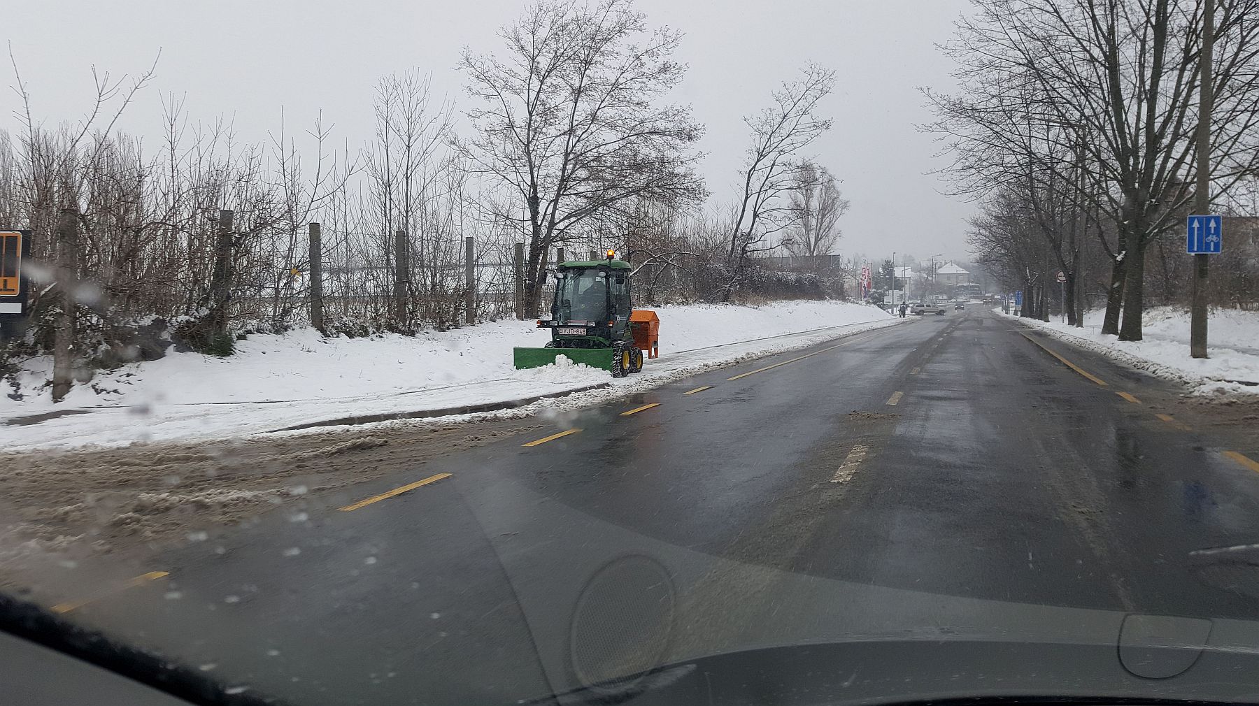 A város főútjai vizesek, néhol latyakosak, a kisebb utcák latyakosak azonban az alásózásnak köszönhetően sehol nincs ráfagyva a víz a burkolatra.