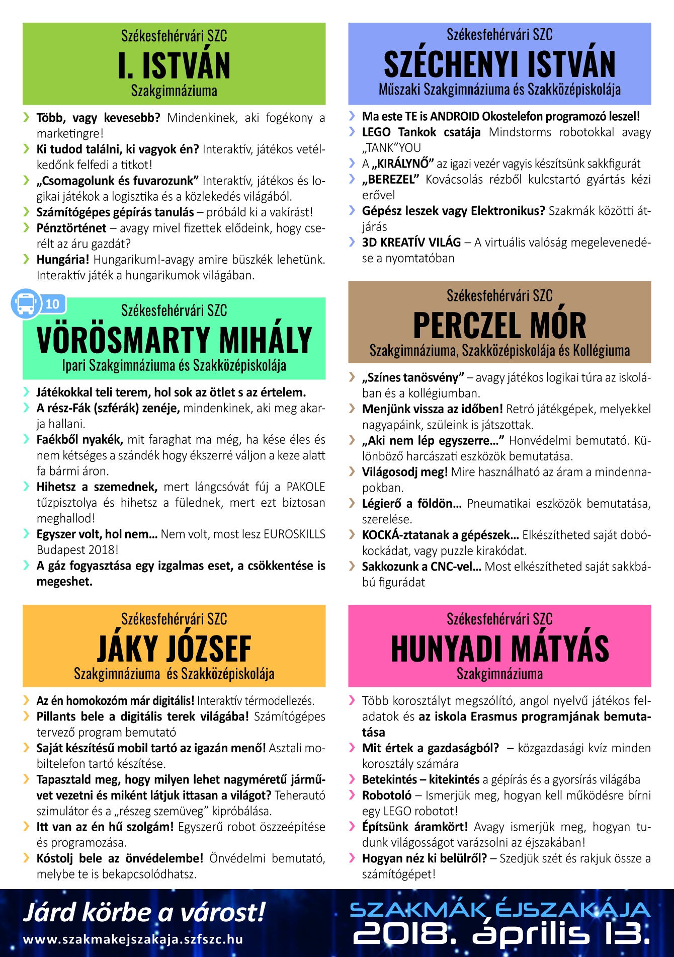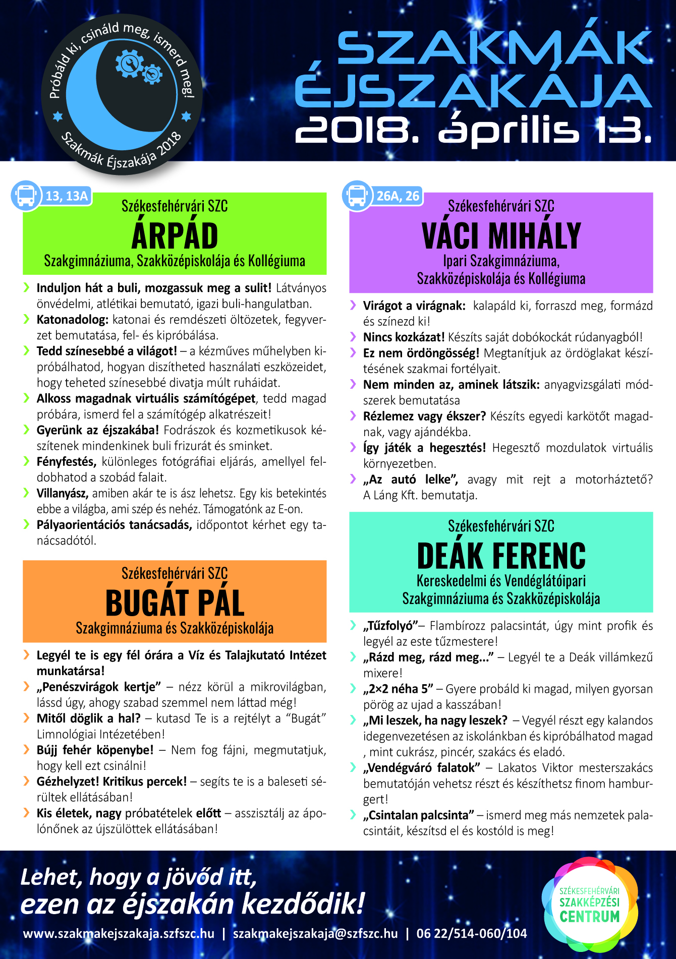 Április 13-án, a Szakmák Éjszakáján a diákok megnézhetik, melyik foglalkozás mit takar és végigjátszhatnak akár ezer pályát néhány óra alatt. A Székesfehérvári Szakképzési Centrum 10 tagintézménye csatlakozik a Szakmák Éjszakája sorozathoz, Fehérváron az Árpádban, a Deákban, a Bugátban, a Hunyadiban, az I. Istvánban, a Jákyban, a Széchenyiban, a Váciban és a Vörösmartyban is lesznek programok.