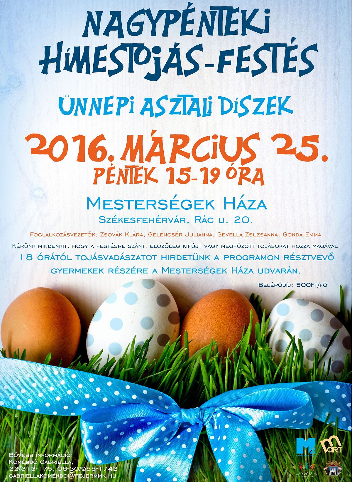 Székesfehérvár kézműves mesterei, népi hagyományőrzői nagy szeretettel készülnek az év különféle ünnepi időszakaira, így lesz ez Húsvét alkalmából is. A Mesterségek Háza két hagyományos, igen népszerű rendezvénnyel örvendezteti meg a családokat a hétvégén. Régi szokás szerint Nagypénteken díszítették, írták, karcolták a tojásokat. E nap gazdag hagyományait ismerhetik meg az érdeklődők március 25-én 15.00 órától a Rác utca 20. szám alatti házban. A foglalkozásokat a megye szakavatott kézműves mesterei, Zsovák Klára, Gelencsér Julianna, Sevella Zsuzsanna és Gonda Emma vezetik. A díszítés mellett húsvéti ajándékokat, ünnepi asztal-dekorációkat, tojástartókat, üdvözlőkártyákat lehet készíteni a Játszótárs Játékkészítő Műhely közreműködésével. A szervezők kérik, hogy a résztvevők hozzanak magukkal festésre szánt kifújt, vagy főtt tojásokat. 18.00 órától a gyerekeknek szervezett tojásvadászat zárja a programot. Amit a kicsik megtalálnak, azt természetesen haza is vihetik magukkal! A belépődíj 500 forint lesz.