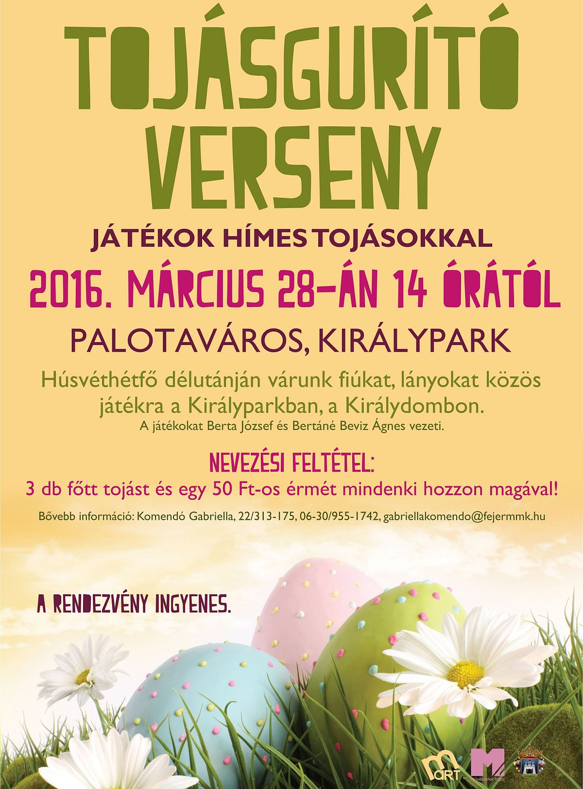 Egy évtizedes múltra tekint vissza Székesfehérváron a palotavárosi Királyparkban rendezett, húsvéthétfői tojásgurító verseny, amely idén sem maradhat el, március 28-án 14.00 órától várják az érdeklődőket a szokott helyszínen. A rendezvény a Magyarországi Alkotóművészek Közép- és Nyugat-dunántúli Regionális Társasága és a Fejér Megyei Művelődési Központ szervezésében valósul meg. A bemutatót és a tojásjátékokat Berta József Király Zsiga-díjas népművelő és Bertáné Beviz Ágnes vezetik. A fiúknak és lányoknak három darab főtt tojást és egy 50 forintos érmét szükséges vinniük. A részvétel ingyenes.