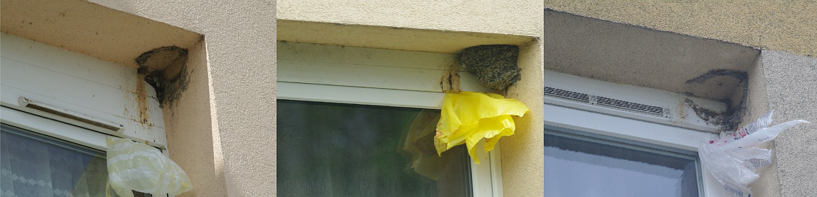 A Rigó és a Gerle utcában néhány helyen kalapáccsal levert fecskefészkek szomorú nyomát látni. Mennyi munka volt pedig megépíteni ezeket...! Hány kilométert kellett repülni egyenként a másfélezer sárgombóccal, hogy elkészüljön a gömbölyű, biztonságosnak hitt fészek, ami aztán egy pillanat alatt elpusztul és a mélybe zuhan. Jó esetben üresen, rossz esetben tojásokkal, fiókákkal együtt. Más emberek a már kész fészek alá akasztottak műanyag szatyrot, ami még szörnyűbb. A fecskepár napokig röpködött kétségbeesetten, de a libegő nejlontól nem mertek visszaszállni. Ha már volt a fészekben tojás vagy fióka, azokra itt is biztos pusztulás várt.