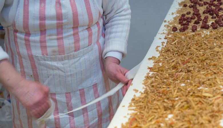 „Akkor jó a tészta, ha annyira vékony, hogy egy újságot alatta el lehet olvasni. Nem baj, ha nyújtás közben néhány helyen szakad, mert úgyis fel kell tekerni, és nem fog látszódni. Csak ezekre a részekre nem kell tölteléket tenni, nehogy kifolyjon.” A hártyavékony lapra Erzsi néni olvasztott zsírt csepegtetett, majd megszórta egy széles csíkban búzadarával, hogy legyen, ami felfogja a meggy levét. Erre jött egy kis pirított búzadara, majd a cukrozott meggy, mint a grízes-meggyes töltelék fő alkotó elemei. Mivel kétfajta rétes készült, ezért a csík másik oldalára fahéjas-zsemlemorzsás alma került.„Én csak a tészta egy részére szoktam a tölteléket szórni. Így a rétes sütés után sem esik szét, és szépen lehet szeletelni.” Erzsi néni ezután finoman megfogta az asztalról lelógó, vastagabb hurkaszerű széleket. Néhány perc alatt az egészet körkörösen lecsipkedte, a két végét behajtotta. A vászon hosszú oldalát megemelte, így a rétes magától felgöngyölődött.