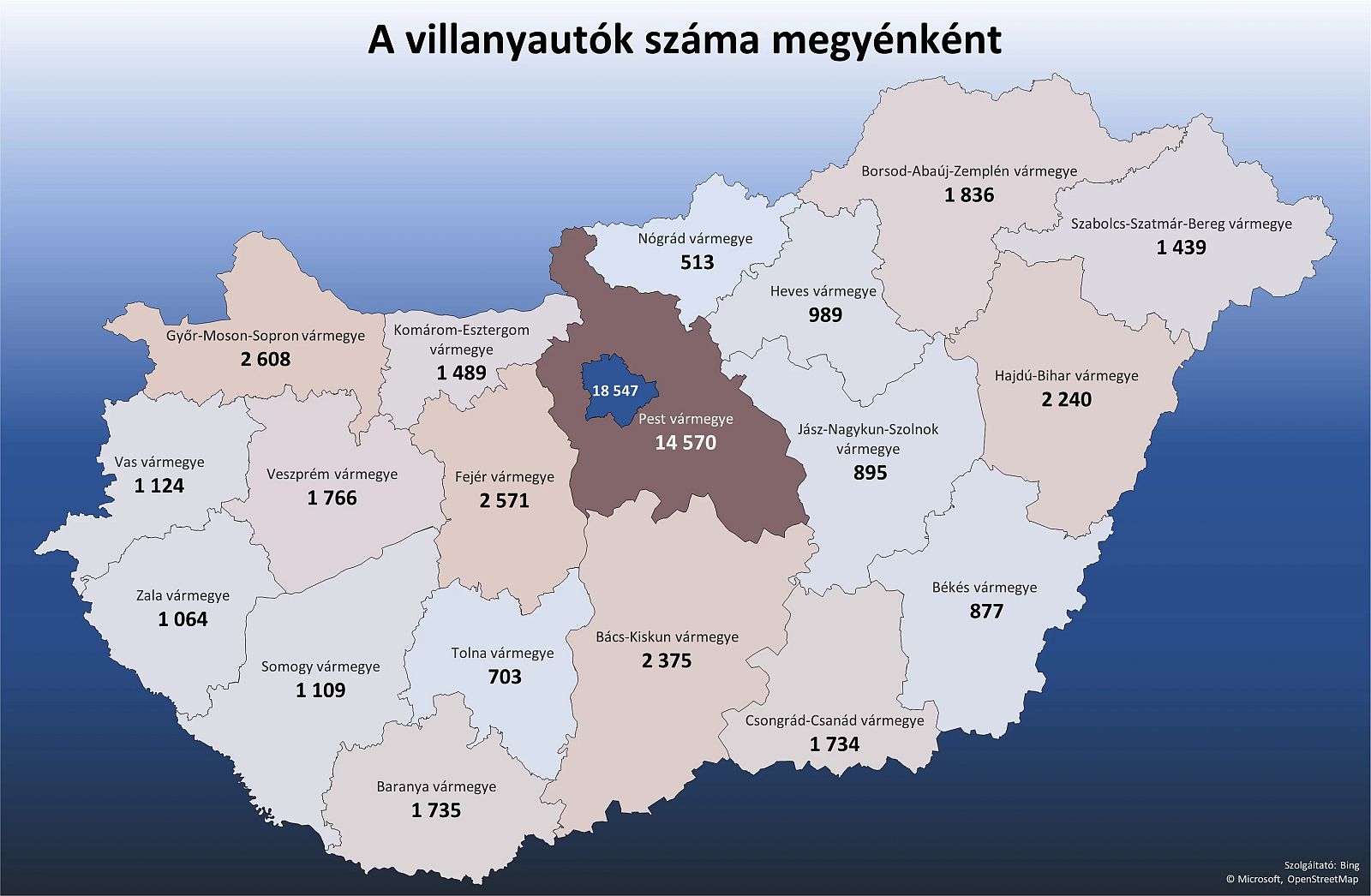 A legtöbb megyében egyelőre borzasztóan kevés, 1000-2000 villanyautóról lehet beszélni a 4,26 milliós magyar személyautó-flottában.