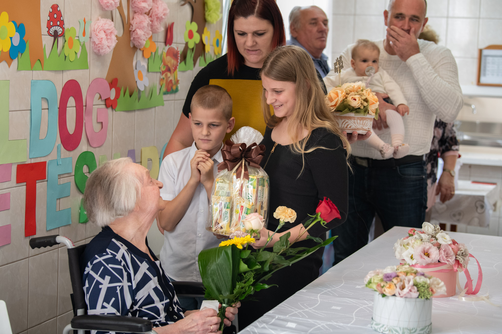 Magdi néni mit sem sejtett a meglepetésről, hiszen ő úgy tudta - az ünneplő „összeesküvők” elterelő története szerint –, hogy a napi program egy kis udvari sétával folytatódik a meleg őszi napsütésben. Így igencsak elcsodálkozott, majd nagyon megörült, amikor az étkezőbe belépve megpillantotta a család apraját és nagyját.