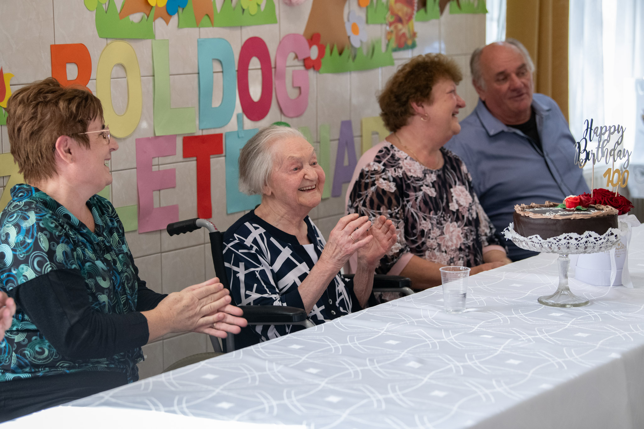 Szerdán koradélután sorra érkeztek a vendégek a Kossuth Zsuzsanna Szociális Intézmény Rákóczi utcai Idősek Otthonába. Három generáció és az otthon dolgozói együtt készültek, hogy dallal, színes virágcsokrokkal és tortával köszöntsék a ma 100. születésnapját ünneplő Tóth Lászlónét.