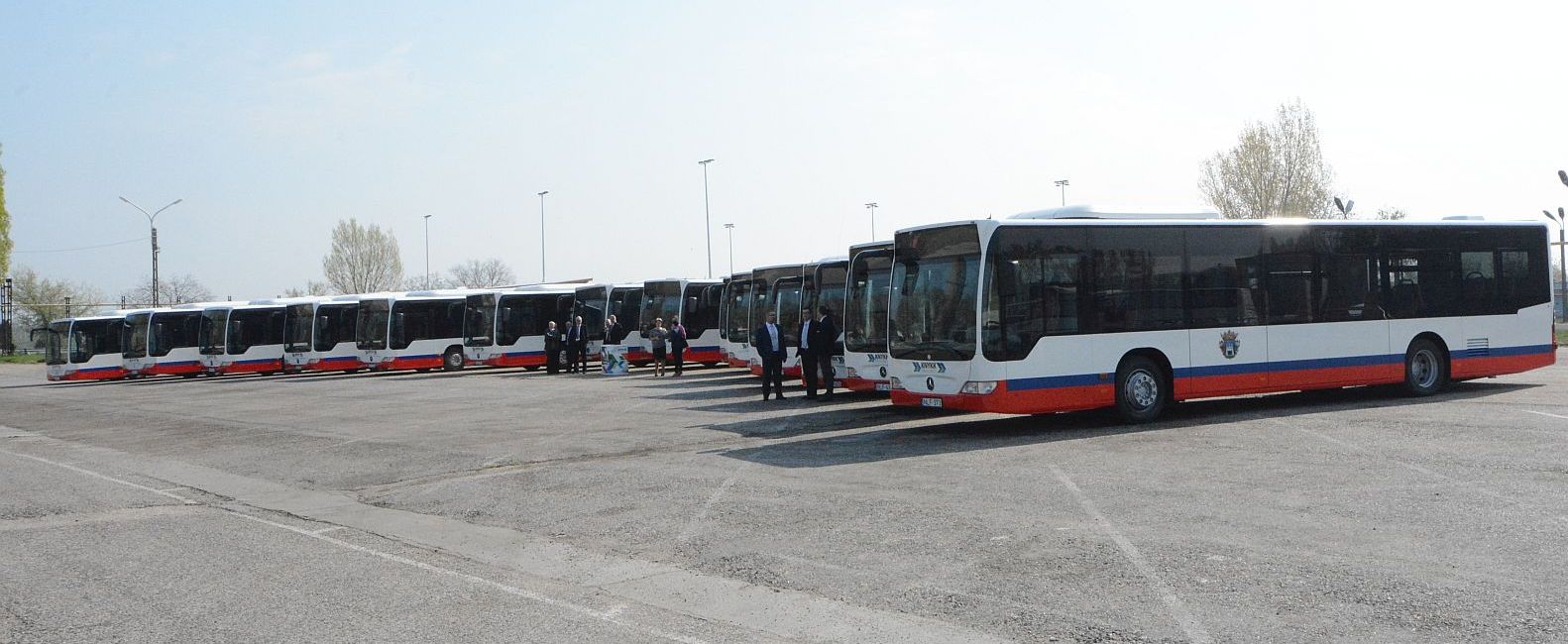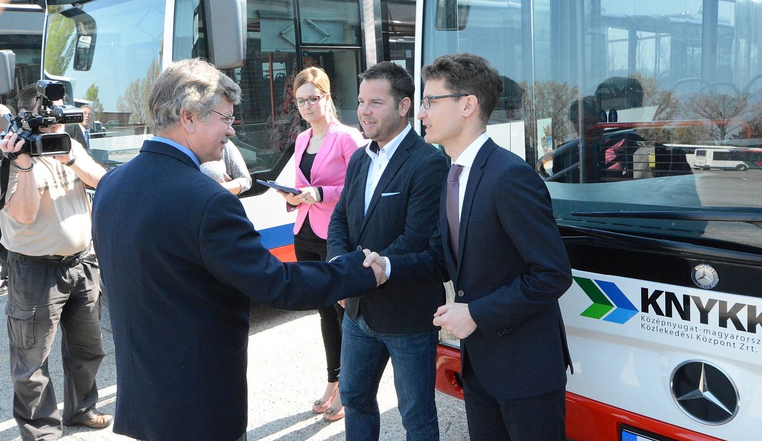 A város polgármestere Cser-Palkovics András és a közlekedési központ vezérigazgatója, Németh Tamás ünnepélyes keretek között adták át a helyi forgalomnak az új beszerzésű autóbuszokat.