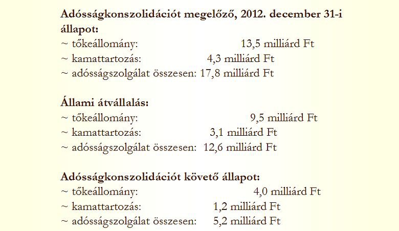 Fehérvár esetében az adósságállomány 70%-át vállalja át az állam. A város számára ez 9,5 milliárd forintos tőketartozást és 3.1 milliárd forintos kamattartozás átvállalását jelent. Az adósságkonszolidációt követően a tőkeállomány 4 milliárd, a kamattartozás 1.2 milliárd forint lesz a korábbi években felhalmozott 17.8 milliárd helyett.
