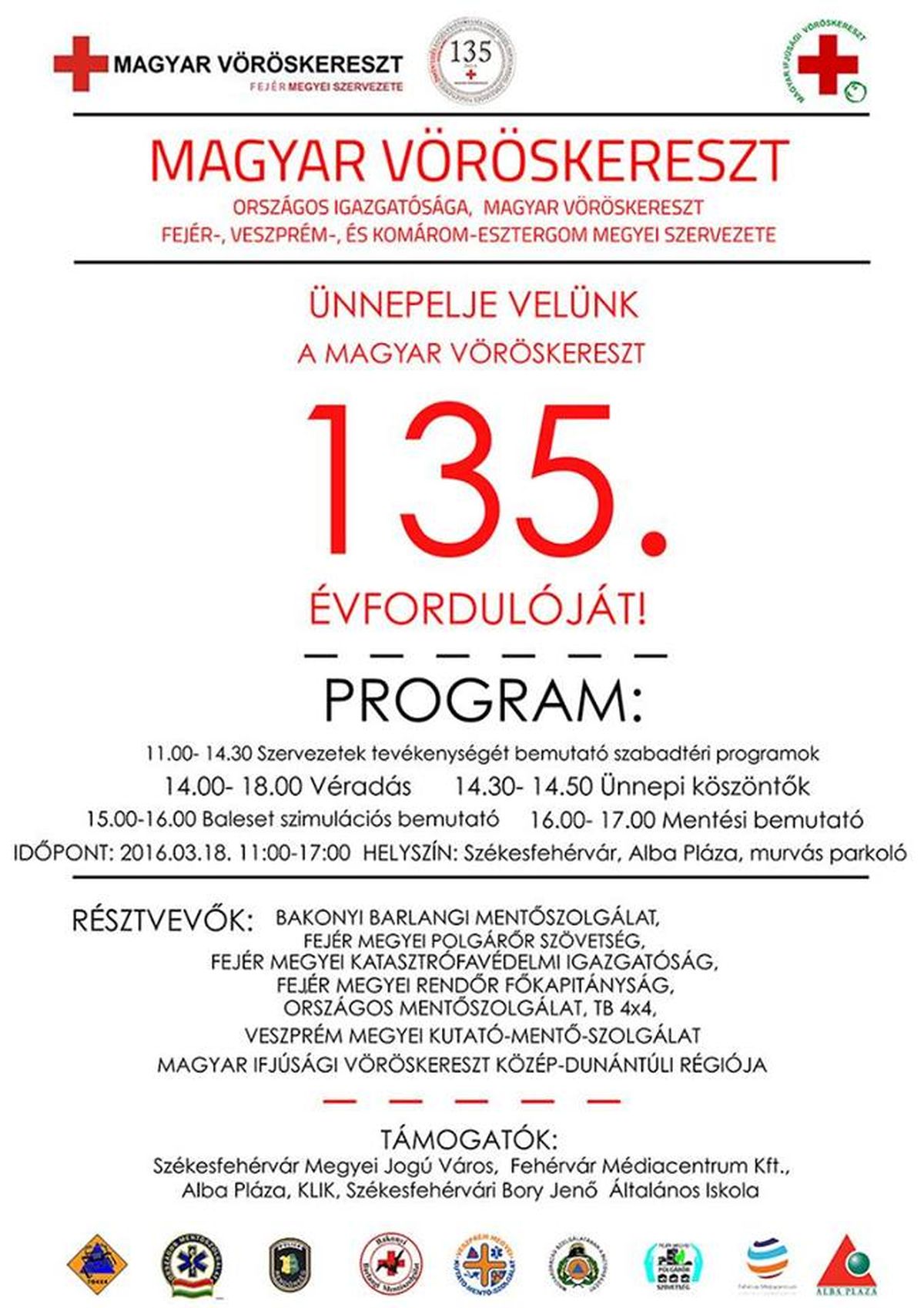 Az idei esztendőben a Magyar Vöröskereszt 135., míg az Ifjúsági Vöröskereszt 95. születésnapját ünnepli. A jeles évfordulók tiszteletére a Magyar Vöröskereszt Országos Igazgatósága, a Magyar Vöröskereszt Fejér Megyei Szervezete, mint főszervező együttműködve a szomszédos Veszprém, és Komárom – Esztergom Megyei Szervezetekkel, valamint a társszervezetekkel közös rendezvényt szervez pénteken Székesfehérváron.