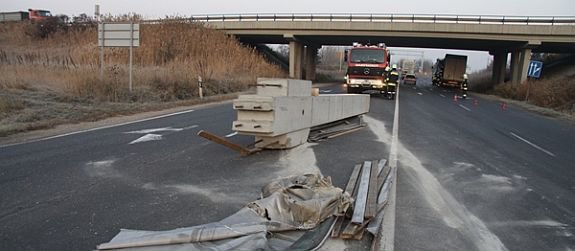 Hétfőn reggel kérték a tűzoltók segítségét a 81-es főúton, Székesfehérvár határában. A 7-es főút felüljárója előtt egy DAF típusú nyerges vontatóról kanyarodás közben az útra esett egy 14 tonnás beton hídelem, amely forgalmi akadályt képezett. A hídelemet a tűzoltók daruval emelték le az útról, a műszaki mentés idején teljes útzár volt a helyszínen. Személyi sérülés nem történt.