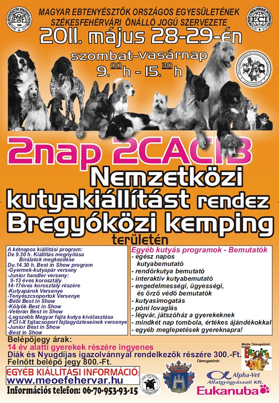 A Magyar Ebtenyésztők Országos Egyesületének Székesfehérvári Szervezete nemzetközi kutyakiállítást rendez szombaton és vasárnak, május 28-29-én a Bregyó Sportcentrumban. Az egész napos bírálatok mellett lesz engedelmességi és ügyességi bemutató, kutyasimogatás, póni lovaglás, továbbá játszóház is várja a gyerekekkel érkezőket. A 14 év alattiaknak ingyenes a belépés, diákoknak és nyugdíjasoknak 300, felnőtteknek pedig 800 forintba kerül a jegy.