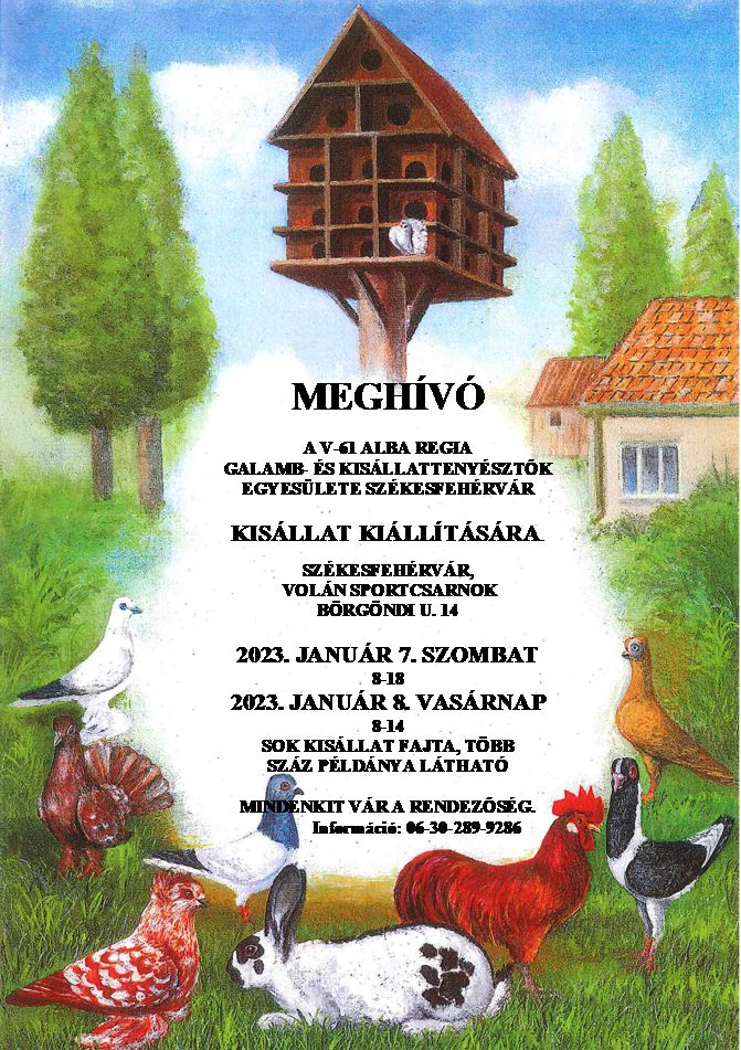 Január 7-én reggel 9 és délután 3 között az óvodai és iskolai csoportoknak ingyenes látogatásra van lehetősége, melyhez szakmai vezetést is biztosítanak. Jelentkezni a 30/289-92-86-os telefonszámon lehet. A gyerekeknek 14 éves korig ingyenes a belépés a kiállításra egész hétvégén és akik nagyszülőkkel érkeznek ott az egyik nagyszülőnek is ingyenes a belépés - mondta Szűcs Antal, a V-61 Alba Regia Galamb- és Kisállattenyésztők Egyesületének elnöke.