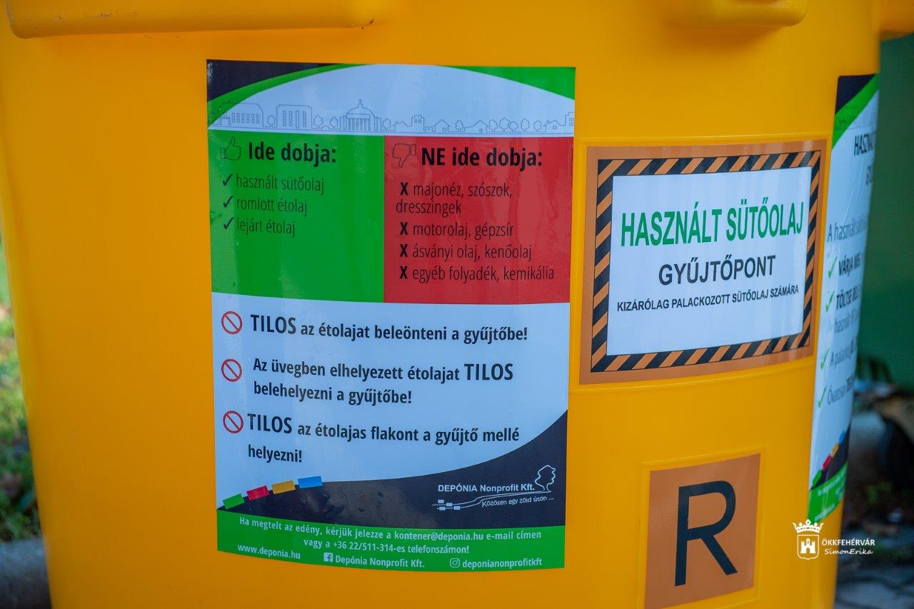 lakossági használt sütőolaj begyűjtését. A megtelt palackokat összesen 23 gyűjtőponton adhatják le a fehérváriak. A begyűjtött sütőolaj hasznosítóhoz kerül, ahol egy zárt rendszerben száz százalékban