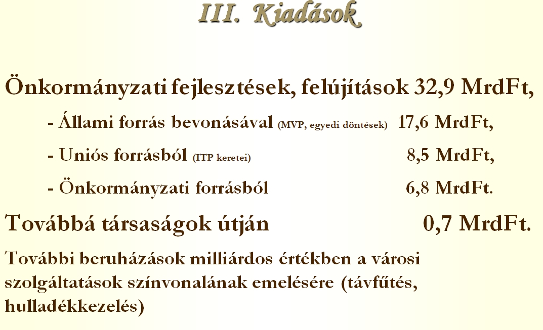 Valamennyi kiemelt program folytatódik idén is: az Ybl Miklós Intézményfejlesztési Program, a Saára Gyula Útfelújítási Program és a Kégl György Városi Egészségügyi Program mellett folytatódik a 65 év felettiek támogatása, az okostantermek kialakítása, a robotikai program és a jelentős környezetvédelmi fejlesztések is.