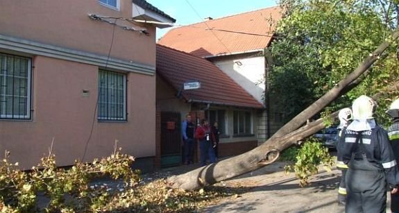nyárfa törzsét kifordította a földből a szél, s a fa egy lépcsőház bejárata elé dőlt
