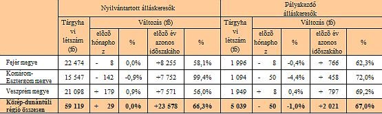 A Központi Statisztikai Hivatal adatai szerint az országos munkanélküliségi ráta 9,6%, a régiós 8,4%. A régión belül Veszprém megye rátája a legmagasabb: 9,5%, Fejér megye a második 8,3%-kal, Komárom-Esztergom megye mutatója 7,4%. Fejér megyében év elején 18.555 regisztrált munkanélkülit tartottak nyilván és szinte folyamatos növekedés mellett október végére elérte a 22.474-et munkanélküliek száma.