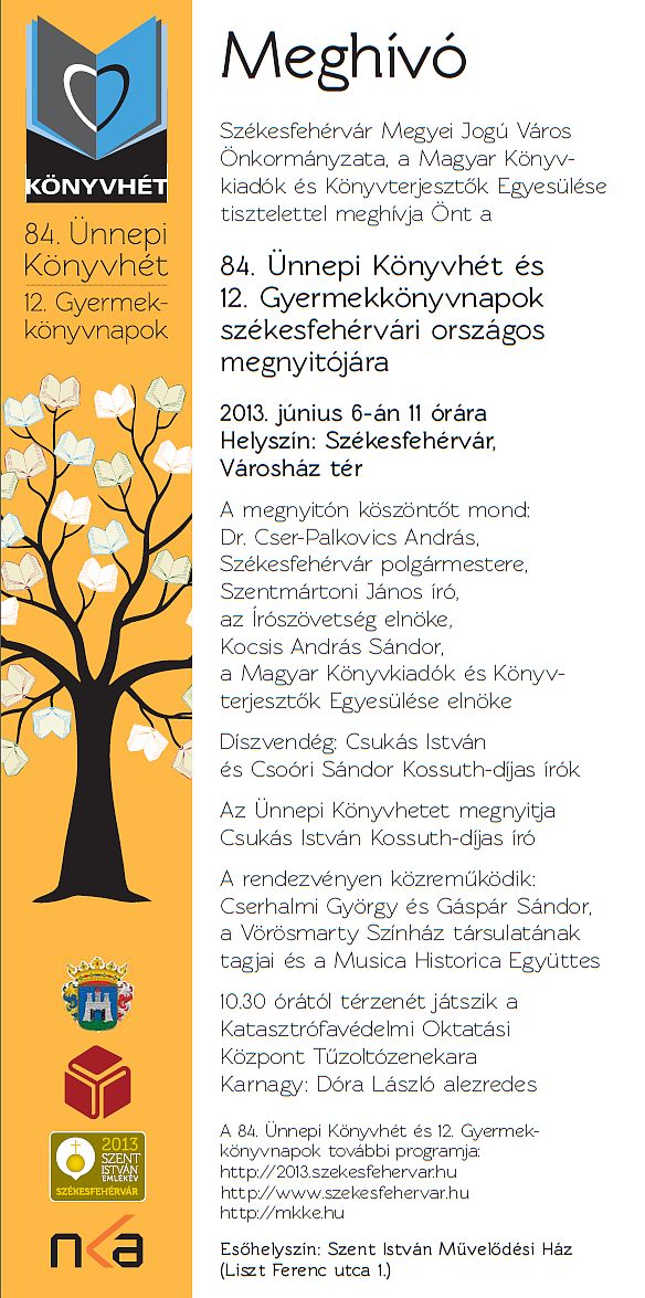 Az idei évben Székesfehérvár ad otthont a 84. Ünnepi könyvhét és 12. Gyermekkönyvtárnapok országos megnyitójának június 6-án 11 órakor a Városház téren. A könyvhét alatt a városba látogat a magyar irodalom színe-java, többek között Csukás Istvánnal, Csóri Sándorral, Esterházy Péterrel és Czigány Györggyel is találkozhatnak az irodalom kedvelői. A programokat bal oldalon felül az eseményajánlóban részletesen megtalálják!