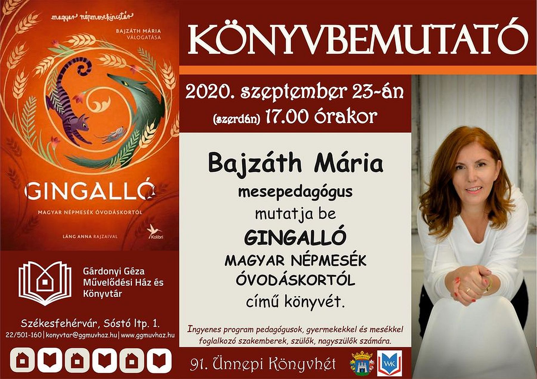 A másik két bemutató a mesék világába kalauzolja az érdeklődőket: szeptember 23-án, szerdán 17 órakor Bajzáth Mária mesepedagógus mutatja be Gingalló – Magyar népmesék óvodás kortól című könyvét a Gárdonyi Géza Művelődési Ház és Könyvtárban.
