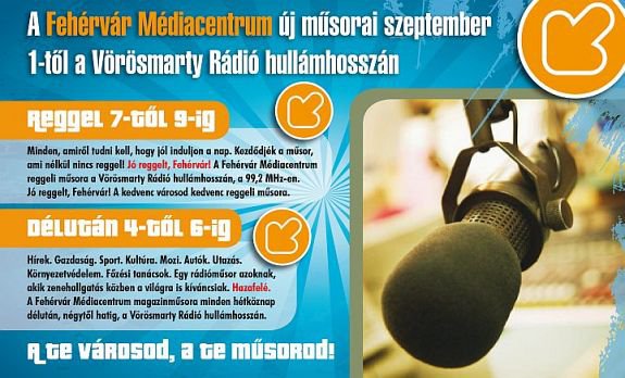 Szeptember 1-től a 99.2 Mhz-en, a Vörösmarty Rádió hullámhosszán hallhatók a Fehérvár Médiacentrum rádiójának műsorai. Reggel 7-től 9-ig Schéda Zoltán, a Fehérvár Médiacentrum munkatársa köszönti a hallgatókat. Délután 4-től 6-ig pedig a Hazafelé című műsorral jelentkezik a Médiacentrum. A két műsor között továbbra is a Vörösmarty Rádió műsorait hallhatják a rádiót kedvelők.