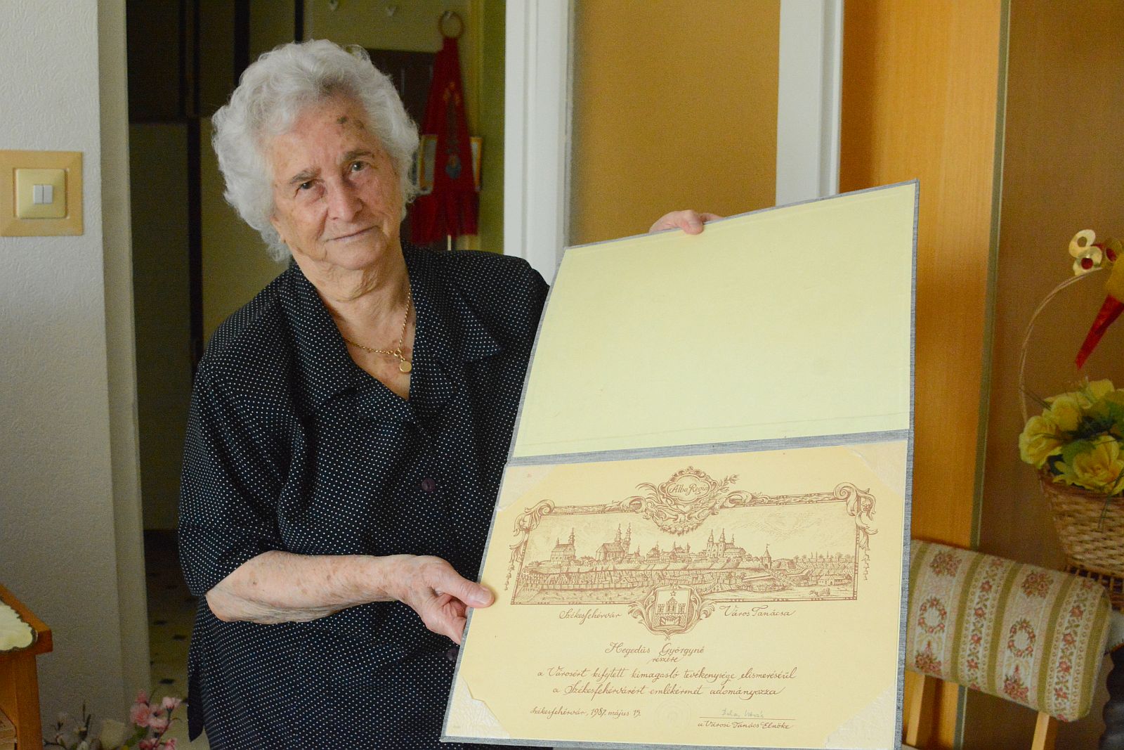 Hegedűs Györgyné, Terike néni 1932. október 14-én született az akkor Zala megyei Bazsiban a család negyedik gyermekeként. Édesapja sajnos korán meghalt és nevelőszülőkhöz került Székesfehérvárra a Rác utcába a testvéreivel együtt. A Selyem utcai iskolában tanult meg írni, olvasni és mivel a nevelőapukája cipész volt, nagyon sok helyre egyedül járt már gyermekként a városban, amikor segített neki.