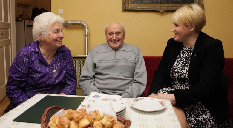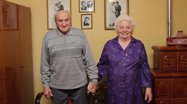 „Elég volt ennyit kibírni!” – ezt válaszolta Radics József Deák Lajosné köszöntő szavaira, de mosolya elárulja, hogy korántsem gondolta ő ezt komolyan. Felesége, Kisteleki Erzsébet boldog párja, komoly támasza. Minden szavuk boldogságtól átitatott, bár végig szelíden ugratták egymást. Ha egymás mellé értek, kezük a másikét kereste – egy simogatásra, egy rövidke szorításra. 1952-ben házasodtak, 63 éve élnek együtt boldogan. Két fiúk született, egyikük nem akart elszakadni a harmonikus otthoni légkörtől, emeletet épített a családi házra. A másik gyermek Pestlőrincen él. Kettőjük után négy unoka és öt dédunoka veszi körbe az öreg szülőket. Milliónyi családi fotó kerül elő – bűbájos gyermekek szeretettel bújnak szüleikhez.