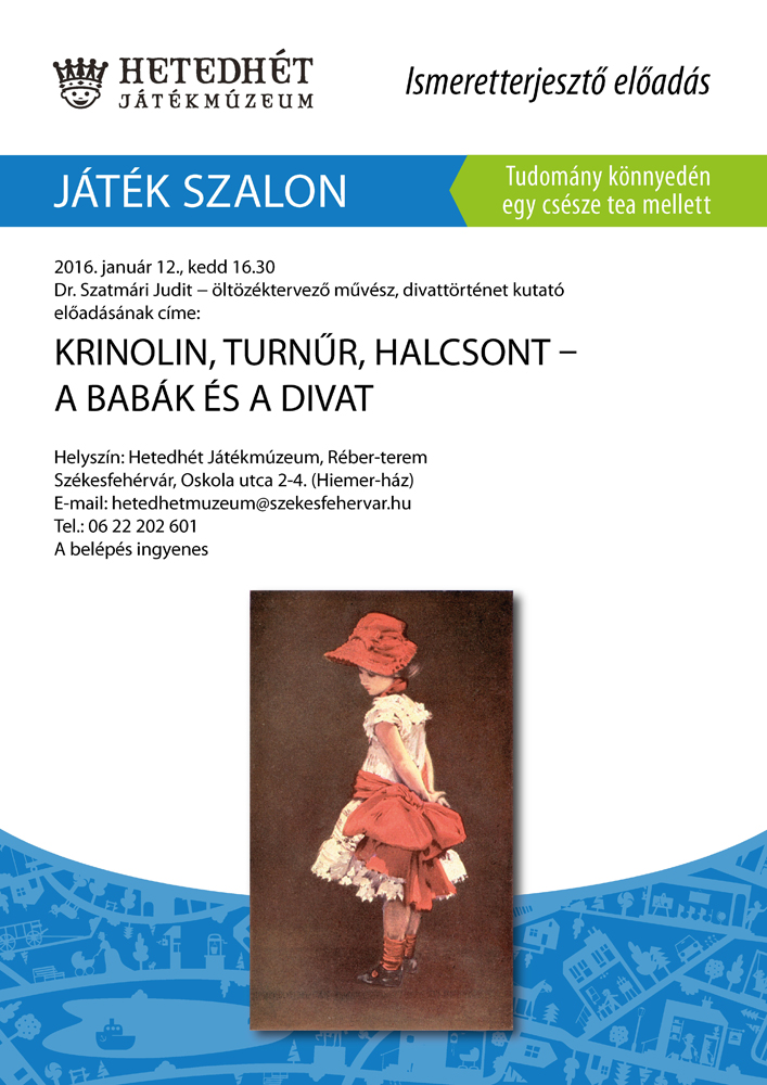 A polgári szalonok teadélutáni hangulatával várnak minden kedves érdeklődőt a Hetedhét Játékmúzeum munkatársai január 12-én, kedden 16.30 órára, a Réber-terembe. Egy csésze tea elfogyasztása mellett egy könnyed ismeretterjesztő előadást hallgathatnak végig a divatot illetve a babákat kedvelők. Az előadó dr. Szatmári Judit öltözéktervező művész, divattörténeti kutató lesz, aki A Magyar Divat 1116 éve című divattörténeti könyv szerzője. A viselettörténeti oktató a Modart Művészet és Divatiskolán, a Kaposvári Egyetemen és a Moholy-Nagy Művészeti Egyetemen is tanít. Kiváló tudományos és művészeti tevékenységét több díjjal elismerték már.
