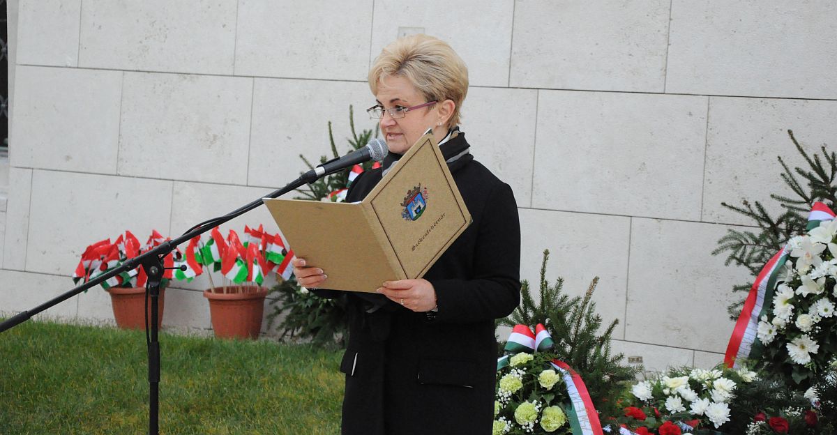 A műsor után Székesfehérvár Megyei Jogú Város Önkormányzata és a Fejér Megyei Önkormányzat nevében Mészáros Attila alpolgármester és Wilmek Tibor alelnök, míg a Tóvárosi Általános Iskola nevében Schnee Zoltánné igazgatóasszony és Hegyi Noémi Diákönkormányzat titkár helyezett el koszorút a feszületnél. Az ünnepség zárásaként a Szózatot énekelték el közösen a megemlékezők.