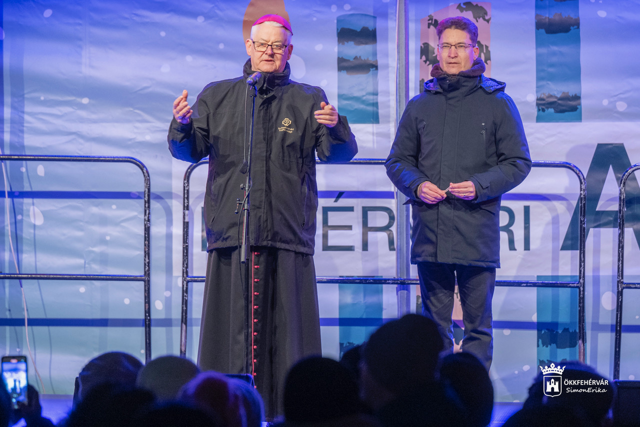 Dr. Cser-Palkovics András polgármester is köszöntötte a város főterén megjelenteket, majd megköszönte Spányi Antalnak, hogy az adventi időszakban megnyitotta a látogatók előtt a Püspöki Palota kertjét, ahova szeretettel vártak mindenkit, aki lelkiekben is szeretett volna felkészülni karácsony ünnepére. Felidézte, hogy az elmúlt hetekben sokan jöttek sétálni Székesfehérvár Belvárosába és más városrészekbe, és vettek részt a közösségi rendezvényeken.