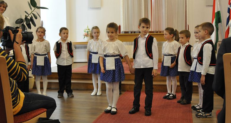 A Brunszvik Teréz Óvoda Katica csoportja után a Hermann Zeneiskola diákjai Légrádi Eszter és Légrádi Noémi ormánsági és szatmári népdalokat adtak elő a Hiemer-ház házasságkötő termében rendezett ünnepségen.