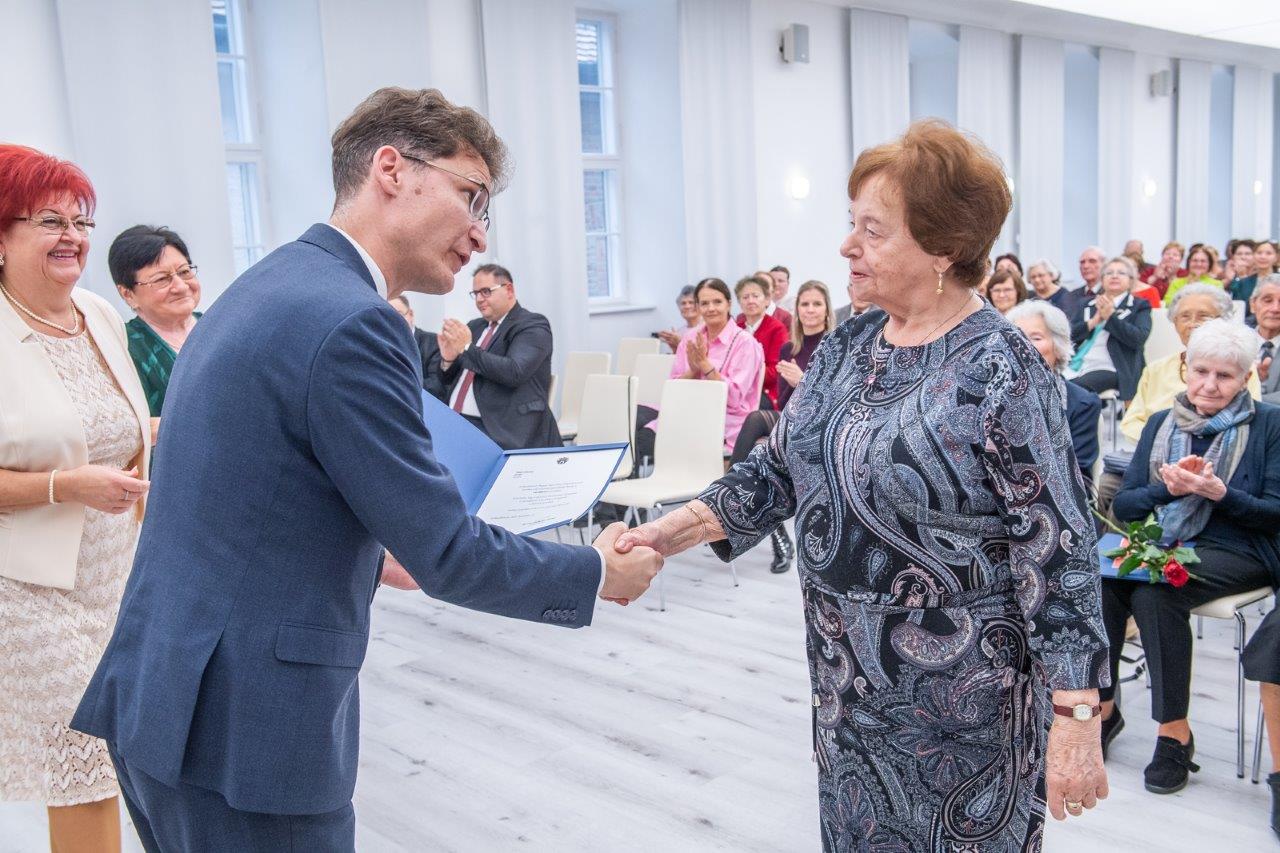 Pedagógus Szakszervezet és Székesfehérvár Önkormányzata évek óta megemlékezik a város pedagógusairól. A hagyományok szerint minden év novemberében vehetik át „színes” diplomáikat azok az óvodapedagógusok, tanítók és tanárok, akik 50, 60, 65,70,75 éve fejezték be tanulmányaikat és kezdték el pályájukat. A járvány miatt az elmúlt két évben nem volt lehetőség a személyes találkozóra, így múlt héten a 2020-ban, ma pedig a 2021-ben évfordulós emlékdiplomásokat köszöntötték a Hiemer-ház báltermében.