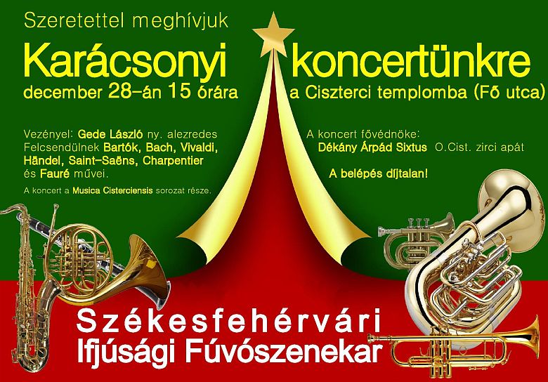 December 28-án a Ciszterci templomban tartja karácsonyi koncertjét a Székesfehérvári Ifjúsági Fúvószenekar. A műsoron Bartók, Bach, Handel, Saint-Saens, Carpentier, Vivaldi és Fauré zeneművei hangzanak el. A koncert a "Musica Cisterciensis" sorozat eseménye. Vezényel Gede László ny. alezredes, az esemény fővédnöke pedig Dékány Árpád Sixtus O.Cist. zirci apát.