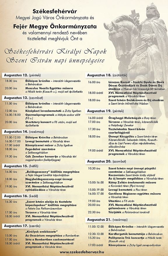 A Csík Zenekar koncertjével kezdetét vette az idei Királyi Napok. A nulladik napon több ezren látogattak el, hogy meghallgassák az immár 23 éve működő, a magyar népzene hiteles tolmácsolójaként ismert zenekart Székesfehérvár Belvárosában. A Csík Zenekar 1988 óta a magyarországi népzenei élet egyik meghatározó szereplője, az eltelt két évtized alatt több rangos zenei díjjal jutalmazták a kecskeméti formációt.