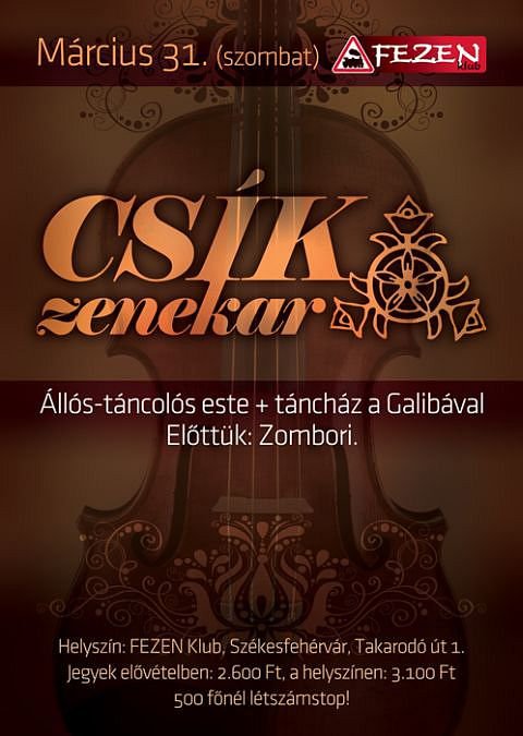 Március 30-án 20.00 órakor Székesfehérváron a Fezen Klubban koncertezik a Csík zenekar. Nem hagyományos koncert, hanem egy igazi táncolós este. A Csík Zenekar előtt a Zombori lép fel, a koncert után pedig táncházban várja a közönséget a Galiba Zenekar.