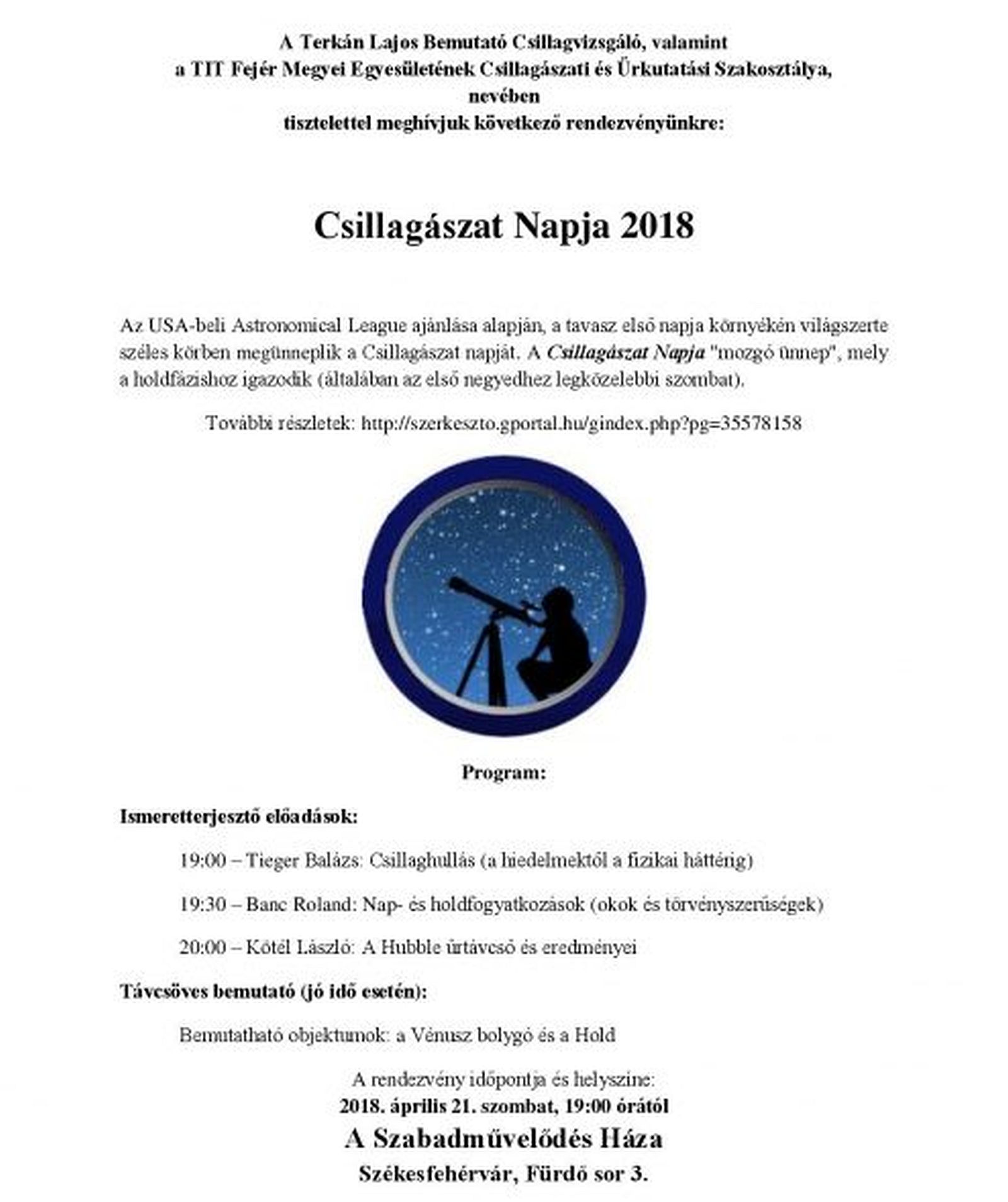 Szombaton ünnepeljük a Csillagászat Napját. A Szabadművelődés Háza Terkán Lajos Bemutató Csillagvizsgálójában 19 órától különféle ismeretterjesztő előadásokkal és jó idő esetén távcsöves bemutatókkal várják az érdeklődőket.