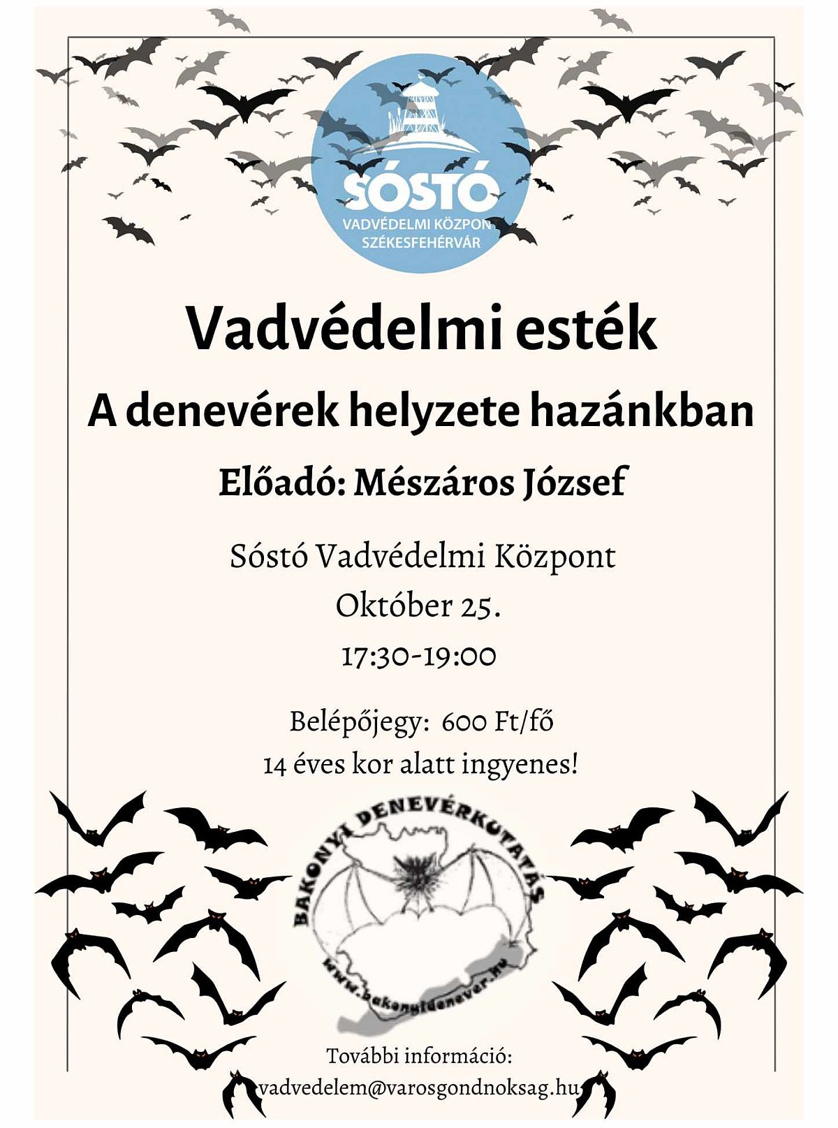 Folytatódik a Vadvédelmi esték című ismeretterjesztő programsorozat a Sóstó Vadvédelmi Központban. Október 25-én, szerdán 17.30 órától a Magyarországon élő denevérek helyzetéről lesz szó. Bár Magyarország ma még jó néhány, nemzetközi szinten is jelentős denevérkolóniával büszkélkedhet, idehaza is aggasztóan fogynak a denevérek.