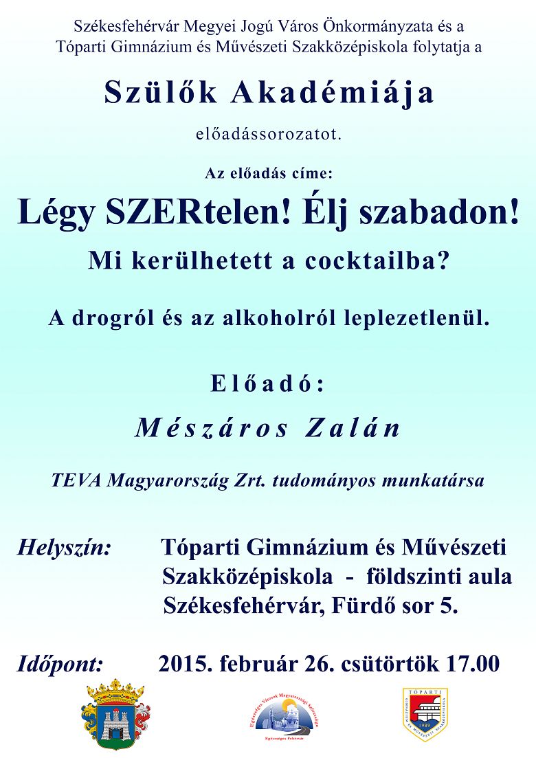 A Tóparti Gimnáziumban folytatódik a Szülők Akadémiája előadássorozat február 26-án csütörtökön 17 órakor. Ezúttal a drogokról és az alkoholról lesz szó. A témában Mészáros Zalán, a TEVA Magyarország Zrt. tudományos munkatársa lesz a szülők segítségére. Az előadás címe: Légy SZERtelen, élj szabadon, avagy mi kerülhet a coctailba?