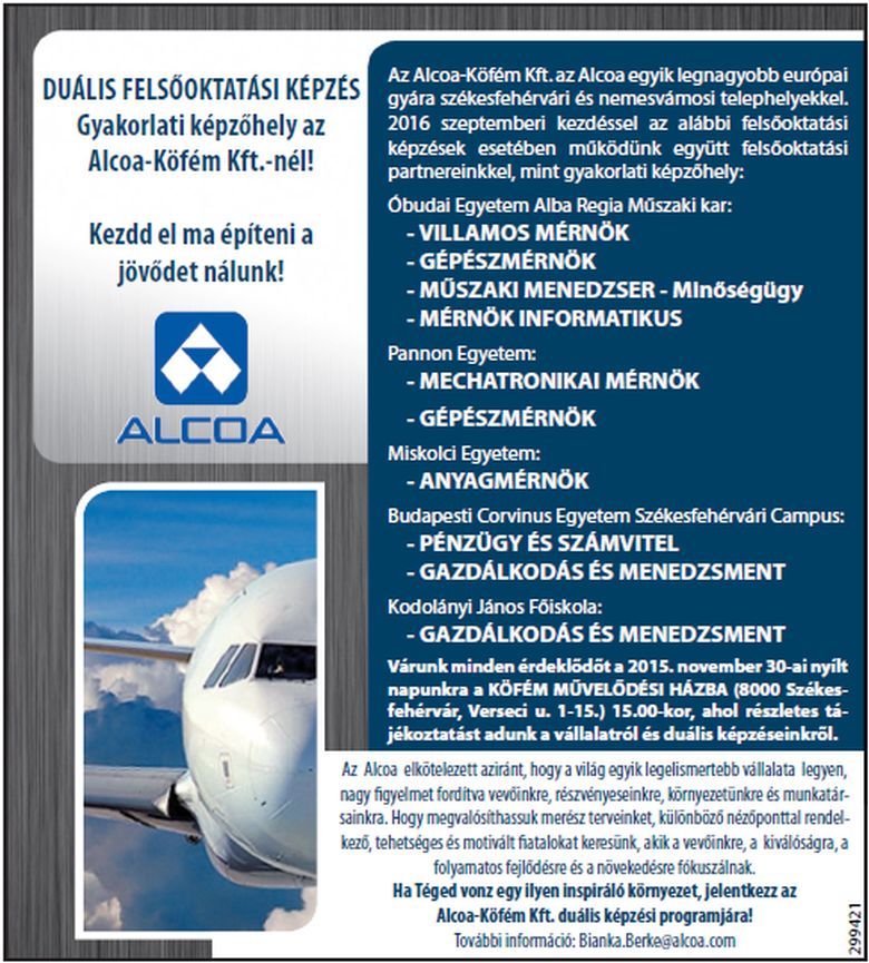 November 30-án 15 órakor a Köfém Művelődési Házban a duális képzésekről tart részletes tájékoztatást az Alcoa-Köfém Kft, ahol az érdeklődő diákok megismerkedhetnek magával a vállalattal is. Az Alcoa 2016 őszétől több egyetem képzési rendszerébe is bekapcsolódik.