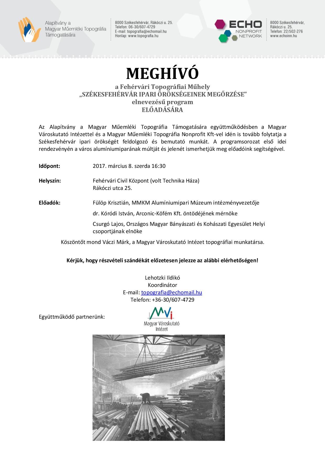 Március 8-án szedán 16.30-tól folytatódik a város ipari örökségét feldolgozó és bemutató programsorozat, melynek első idei rendezvényén Fehérvár alumíniumiparának múltját és jelenét ismerhetjük meg az előadók, többek között Fülöp Krisztián, MMKM Alumíniumipari Múzeum intézményvezetője és dr. Kóródi István, az Arconic-Köfém Kft. öntödéjének mérnöke vezetésével.