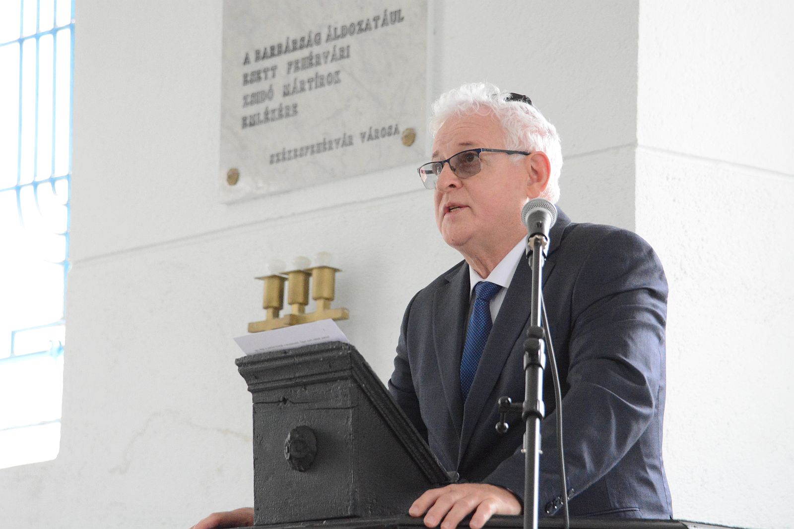 Dr. Grósz Andor, a Magyarországi Zsidó Hitközségek Szövetségének elnöke arról beszélt, hogy amikor 79 éve a magyarországi zsidóságot gettóba kényszerítették, az áldozatok még a gettósítás kezdetén is hittek abban, hogy velük nem történhet meg az, ami a többi, nácik által megszállt országban sorstársaikkal megtörtént. "Annak ellenére, hogy a zsidóság a XX. század első évtizedeiben Székesfehérvár lakosságának csak egy kis részét tette ki, mégis a város polgárságának szerves részét képezte. 1944 tavaszán a német megszállás időszakában a fehérvári zsidókat először az ideiglenes gettókban helyezték el a városon belül, nem sokkal később pedig átvitték őket a Szabó cserépgyárba és a város szélén lévő lovassági laktanyába. A zsúfolt gettó területén 2743 zsidót tartottak fogva, közülük mintegy kétezren voltak fehérváriak.” - emlékeztetett a MAZSIHISZ elnöke.