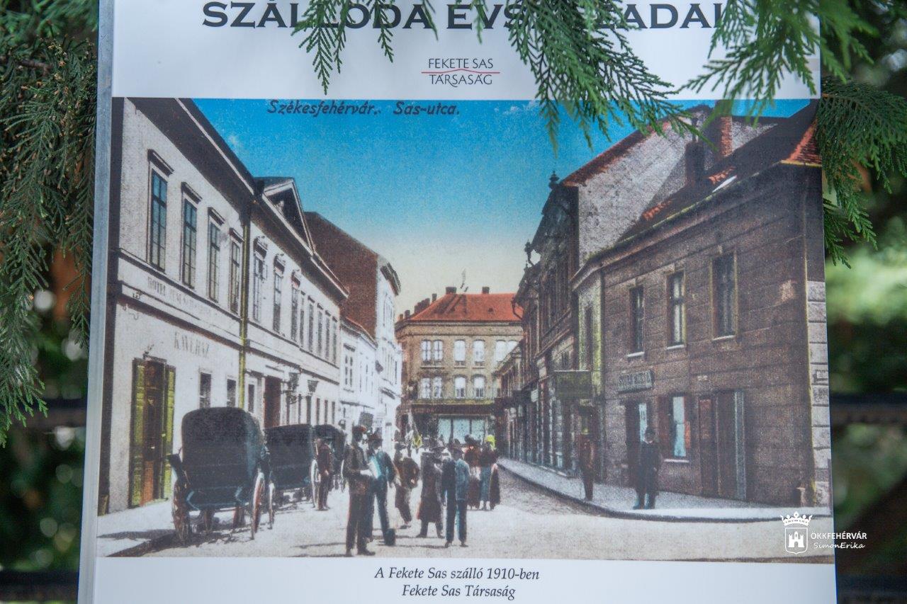 A szabadtéri kiállításon 14 tablón látható, grafikák, festmények, fotók engednek bepillantást a fogadó, majd szálló mindennapjaiba. A Várkörút 11. szám előtti különleges tárlat megnyitóján Váczi Márk történész, a Fekete Sas Társaság elnökhelyettese kiemelte, hogy a Fekete Sas épülete nemcsak a városkép fontos része, hanem évszázadokon keresztül meghatározó szerepet játszott a város kulturális, gazdasági és társadalmi életében is. Felidézte, hogy a város emblematikus épülete 1994 óta használaton kívül áll, és 2006-ban került városi tulajdonba. A Fekete Sas Társaság, az utolsó polgári tulajdonos, az 1944-ben Auschwitzban meggyilkolt Grosz Bernát leszármazottainak kezdeményezésére jött létre, és elsősorban azt a célkitűzést fogalmazta meg, hogy ennek az épületnek a hasznosítására megfelelően kidolgozott és megalapozott ötleteket adjon.