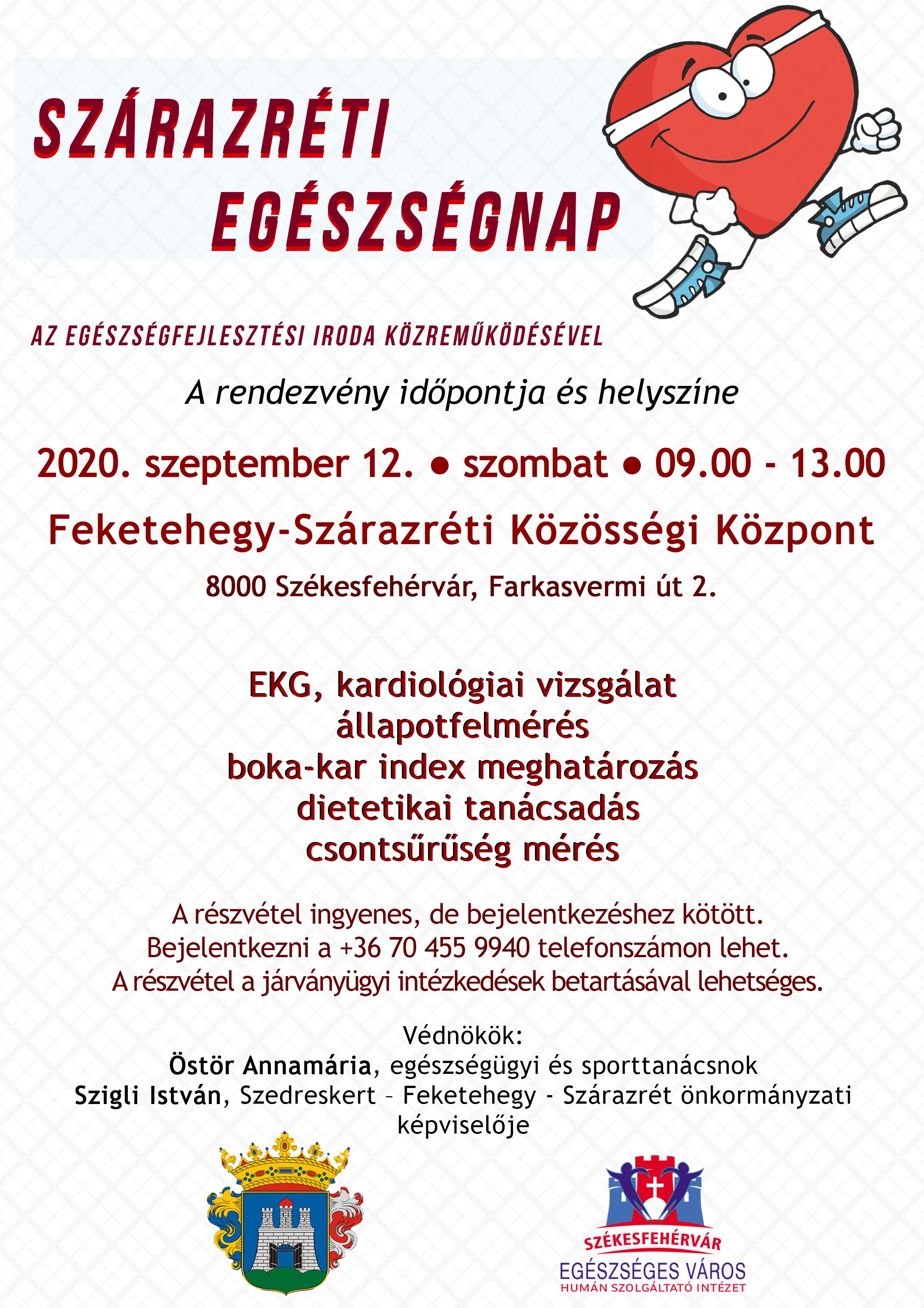 Szeptember 12-én a Feketehegy-Szárazréti Közösségi Központban az Egészségfejlesztési Iroda közreműködésével lehetőség lesz kardiológiai vizsgálatra, bőrgyógyászati szűrésre, dietetikai tanácsadásra, csontsűrűségmérésre és boka-kar-index meghatározásra is.