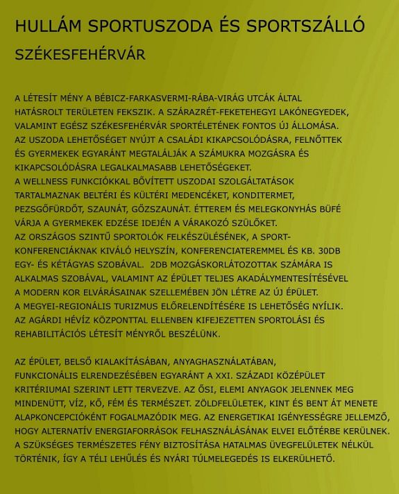 Sárdi Ákos a Hullám 91 Úszó és Vízilabda Egyesület elnöke elmondta, hogy az uszodát pályázati forrásokból és magántőke bevonásával építenék. A teljes bekerülési költség mai áron mintegy egymilliárd forint lenne. A létesítményben egy 33x25 méteres nagymedence lene, ami alkalmas lesz vízilabda mérkőzésekre és rövidpályás úszóversenyekre is, azonban nem rendezvények megtartása a fő cél. A tervek szerint egy tanmedence és egy szabadtéri fürdő is épülne a komplexumban, illetve fitness és wellness funkciók is helyet kapnának a sportlétesítményben. A sajtótájékoztatón elhangzott, hogy a későbbi üzemeltetés érdekében geotermikus fűtés és napelemrendszer is segítené az épület energiaellátását.