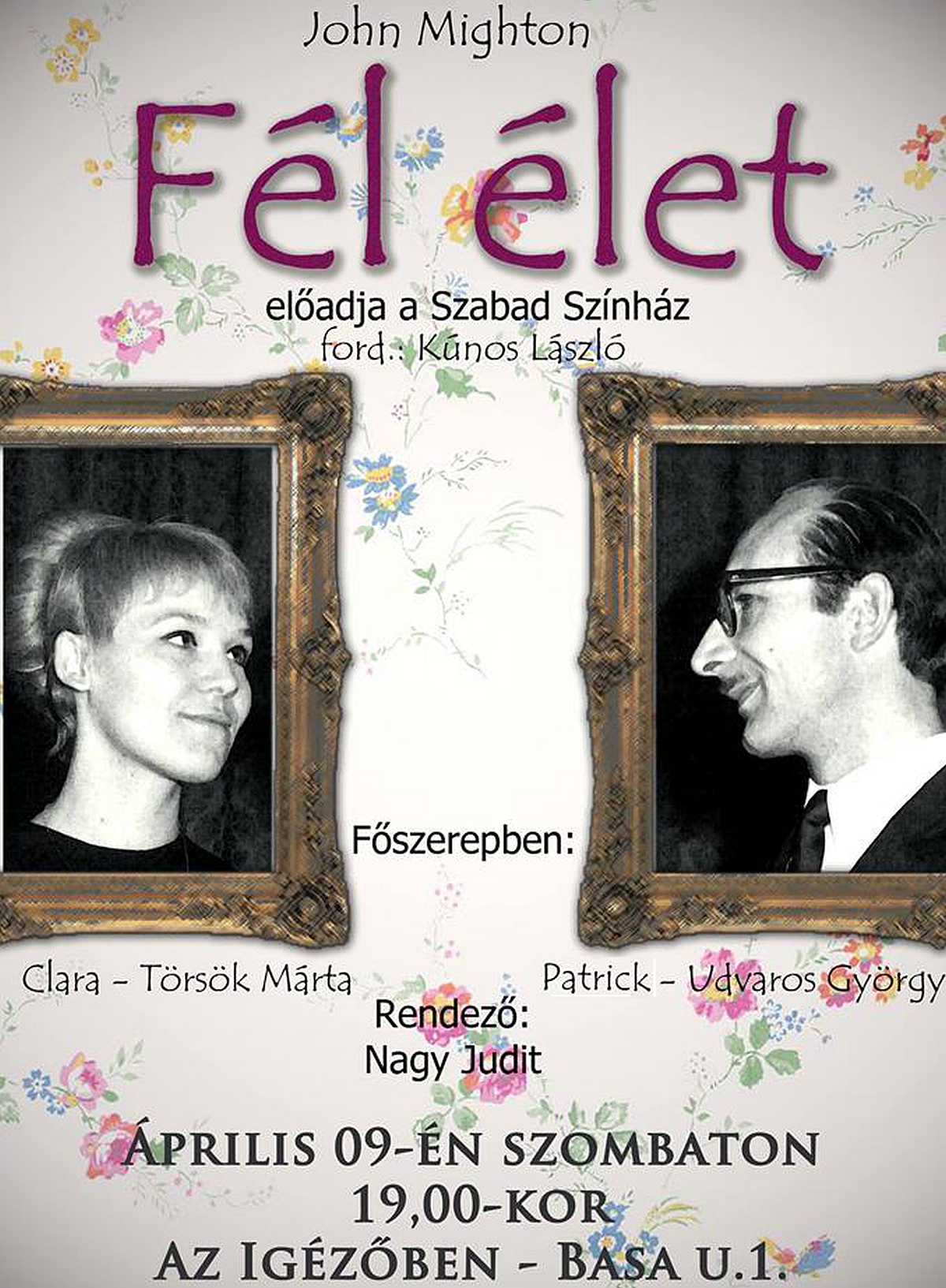 John Mighton Fél élet című darabjában két idős ember története fonódna újra egymásba, és folytatódna onnan, ahol évtizedekkel ezelőtt, a világháború miatt megszakadt. (Nem is gondolnánk, hogy a világégés Kanadát is olyan mélyen érintette, mint egyik-másik darab mozzanataiból kiviláglik.) Csakhogy a leépülésnek indult öregek már nem rendelkeznek saját történetükkel, gyermekeik és egy otthon „foglyai", nem teljesedhet ki a kapcsolatuk sem, bár megrendítő erővel próbálkoznak a maguk öreges, szelíd módján.