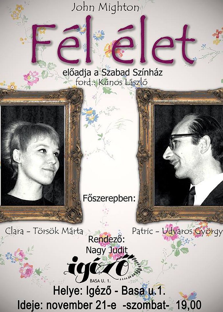 John Mighton Fél élet című darabjában két idős ember története fonódna újra egymásba, és folytatódna onnan, ahol évtizedekkel ezelőtt, a világháború miatt megszakadt. (Nem is gondolnánk, hogy a világégés Kanadát is olyan mélyen érintette, mint egyik-másik darab mozzanataiból kiviláglik.) Csakhogy a leépülésnek indult öregek már nem rendelkeznek saját történetükkel, gyermekeik és egy otthon „foglyai", nem teljesedhet ki a kapcsolatuk sem, bár megrendítő erővel próbálkoznak a maguk öreges, szelíd módján.