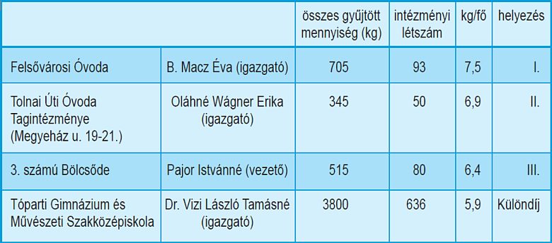 Tavaly ősszel hirdetette meg partnerintézményei között a Depónia Nonprofit Kft. a folyamatos szelektív hulladékgyűjtési akciót. Szerdán délelőtt került sor az első eredményhirdetésre. Steigerwald Tibor, a Depónia Nonprofit Kft. ügyvezető igazgatója és Molnár Tamás ifjúsági tanácsnok sajtótájékoztatón ismertették a nyertesek nevét és díjjal jutalmazták a kimagasló eredményeket. Az egy főre jutó legtöbb hulladékot az idei tanév első felében a Felsővárosi Óvoda gyűjtötte.