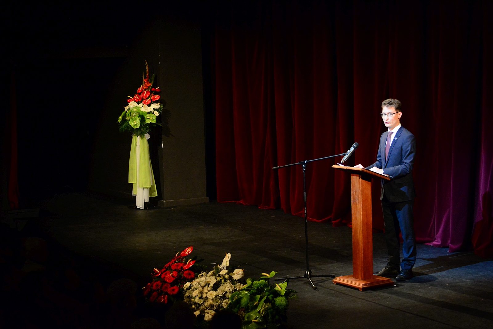 „Ma még köztünk élnek azok, akik a stafétát át tudják adni, és már köztünk élnek azok, akik a szabadságba születtek. Jó lenne, mondhatni múlhatatlan szükség lenne rá, hogy köztük kapcsolat fonódjon, a jövő megemlékezései szerves egységbe forrjanak a múlt történéseivel. Egy emberöltő telt el már azóta is, hogy Magyarország – 1956 örököseként – visszakapta, visszaszerezte szabadságát, önrendelkezését. Felnőtt egy egész generáció, amely éppen olyan ifjú, színes, okos és lelkes, mint azok, akik azt a forradalmat életre keltették. Holnap ők fogják elmondani, megmutatni mindenkinek itt, Fehérvár utcáin, hogyan kell a szabadságért, egymásért fegyvert ragadni. Köszöntsük hát ma este itt, a színházteremben ’56 részeseit, a kánonná vált történelmi pillanatot ünnepi műsorral, és köszöntsük holnap kinn az utcán a forradalmat úgy, ahogyan az a valóságban életre kelt, utcán hömpölygő, szorongó tömegként, erejére ébredt, lázadó emberként!” - zárta ünnepi beszédét Székesfehérvár polgármestere.