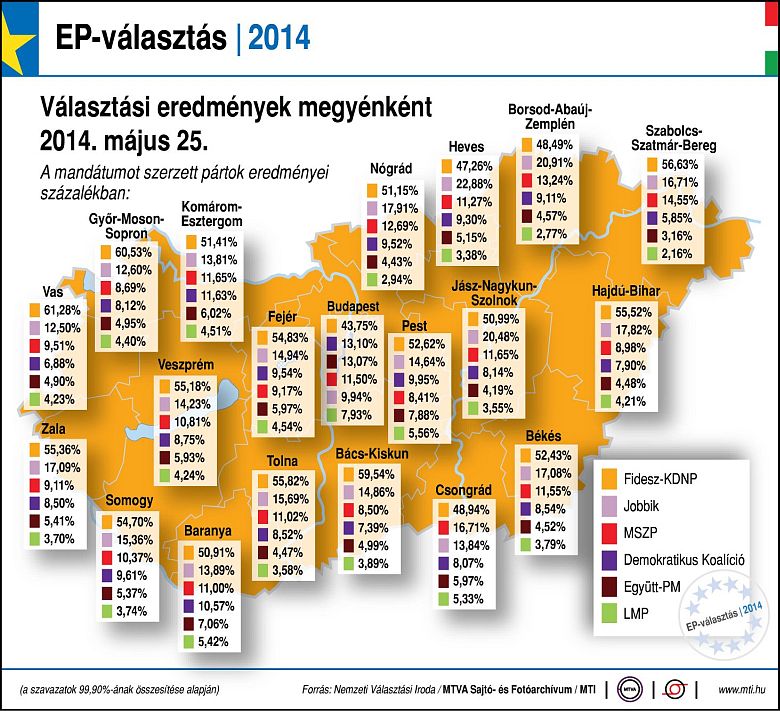 A vasárnapi európai parlamenti (EP-) választáson, a Nemzeti Választási Iroda előzetes adatai szerint, a szavazatok 99,99 százalékának összeszámlálása után a FIDESZ-KDNP a szavazatok 51,49 százalékát, a JOBBIK 14,68 százalékát, az MSZP 10,92 százalékát, a DEMOKRATIKUS KOALÍCIÓ 9,76 százalékát, az EGYÜTT-PM 7,22 százalékát, az LMP pedig 5,01 százalékát szerezte meg.