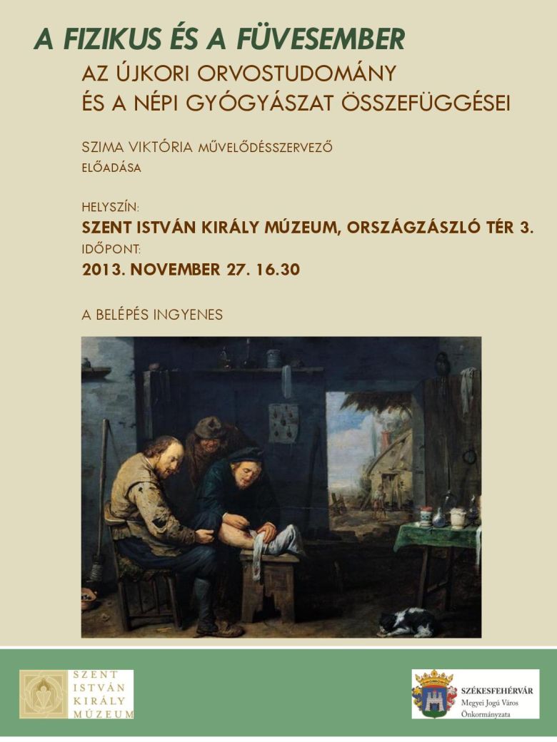 November 27-én 16.30-kor Szima Viktória tart előadást A fizikus és a füvesember. Az újkori orvostudomány és népi gyógyászat összefüggései címmel tartanak előadást a Szent István Király Múzeum Országzászló téri épületében. A belépés ingyenes. A szervezők mindenkit sok szeretettel várnak.