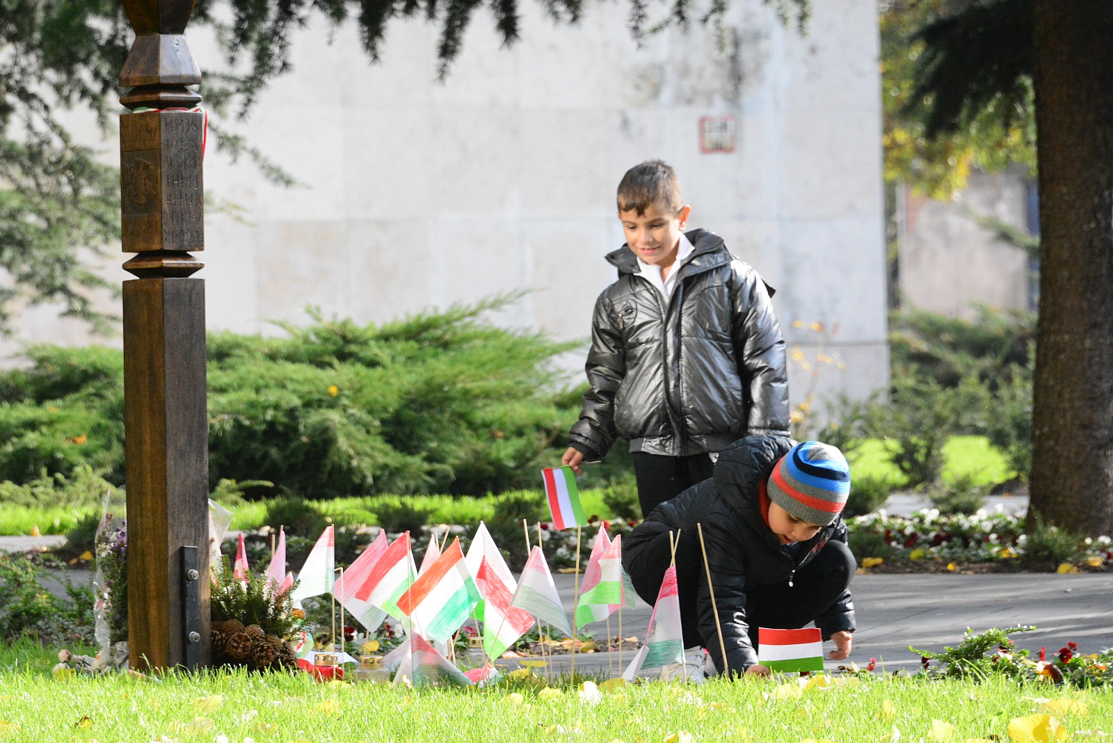 A hallgatók megemlékezése előtt kisiskolások tűztek nemzeti zászlót az október 24-i fehérvári sortűz áldozatainak emléktábláihoz az '56-ososk terén.
