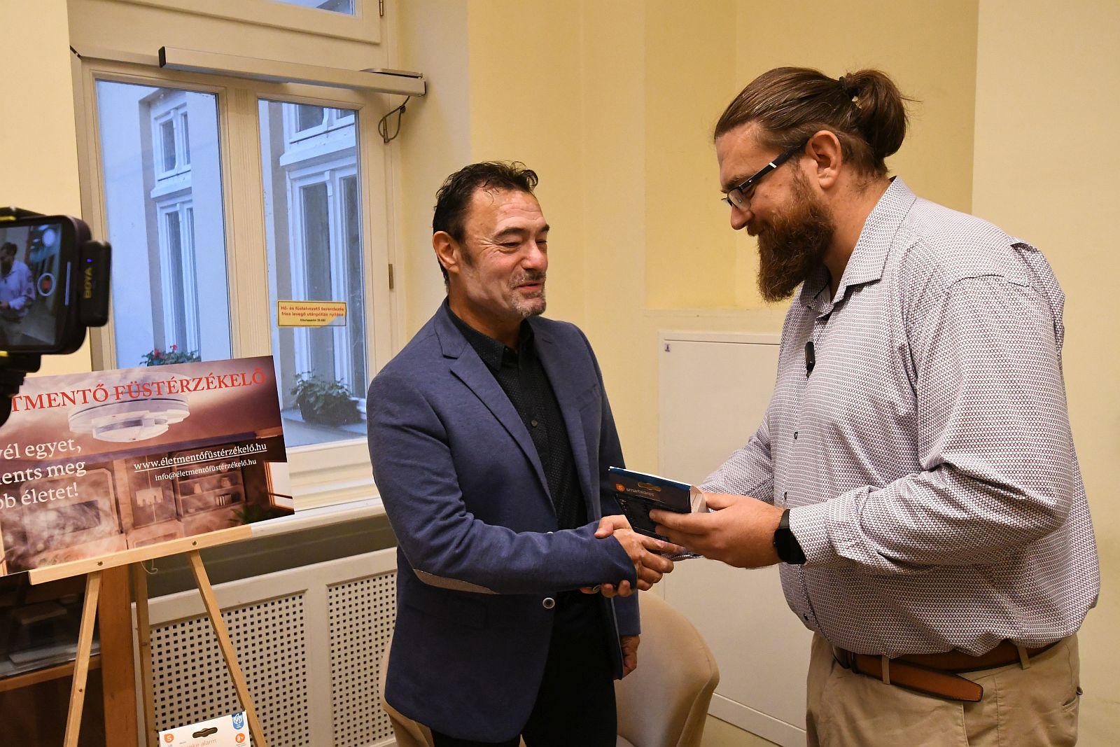 Az első füstérzékelőt Kracsun Zsoltnak adta át a Fehérvári Tűzoltó Egyesület elnöke.